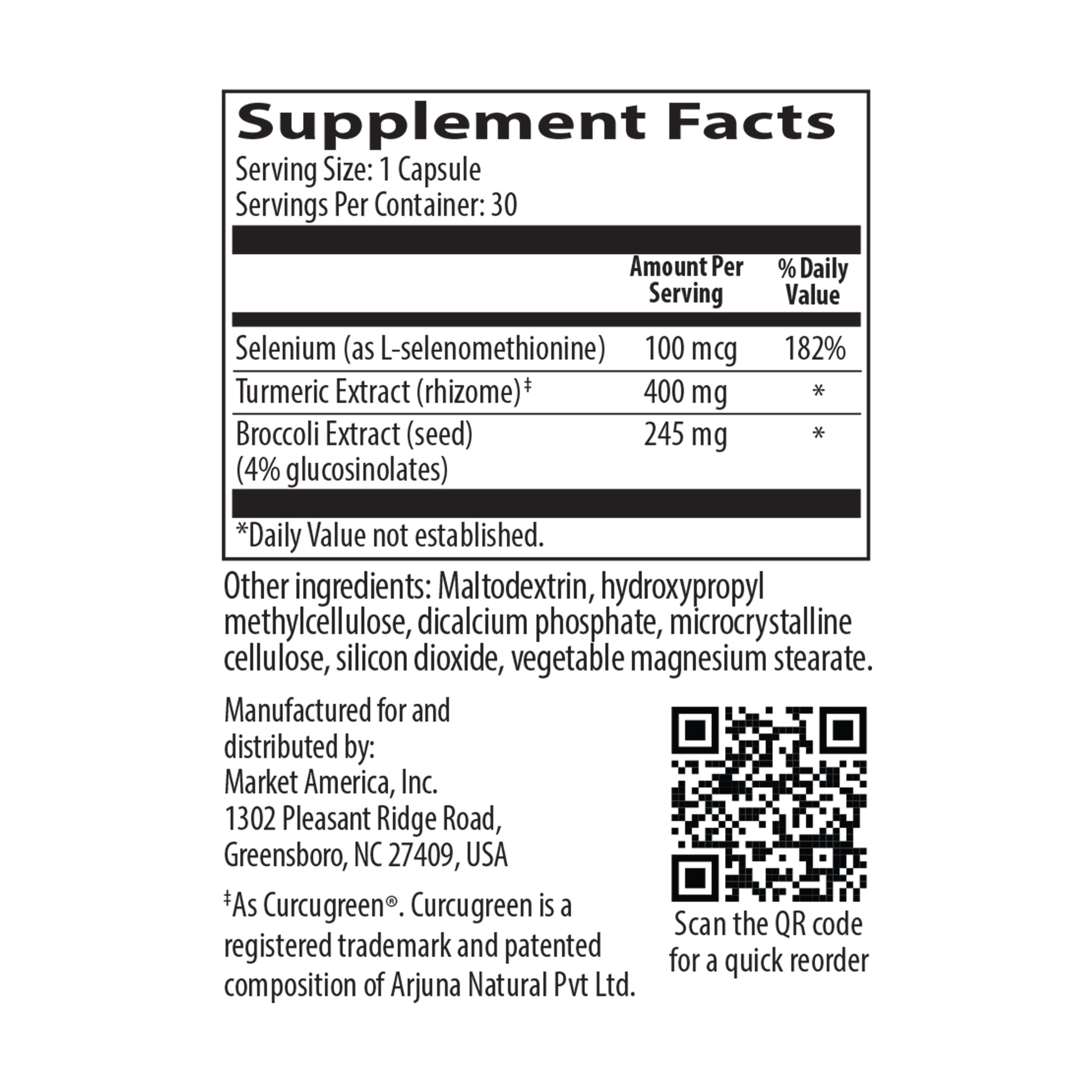 Cellular health is the foundation of overall vitality, and protecting cells from oxidative stress is critical for long-term wellness. That’s where the dynamic combination of Curcugreen™ turmeric extract, L-selenium and dry seed broccoli extract comes in. Curcugreen™ (BCM-95®) delivers highly bioavailable curcumin — offering up to seven times greater absorption than standard turmeric. Curcumin is renowned for its ability to support healthy cellular activity and shield cells from oxidative stress.