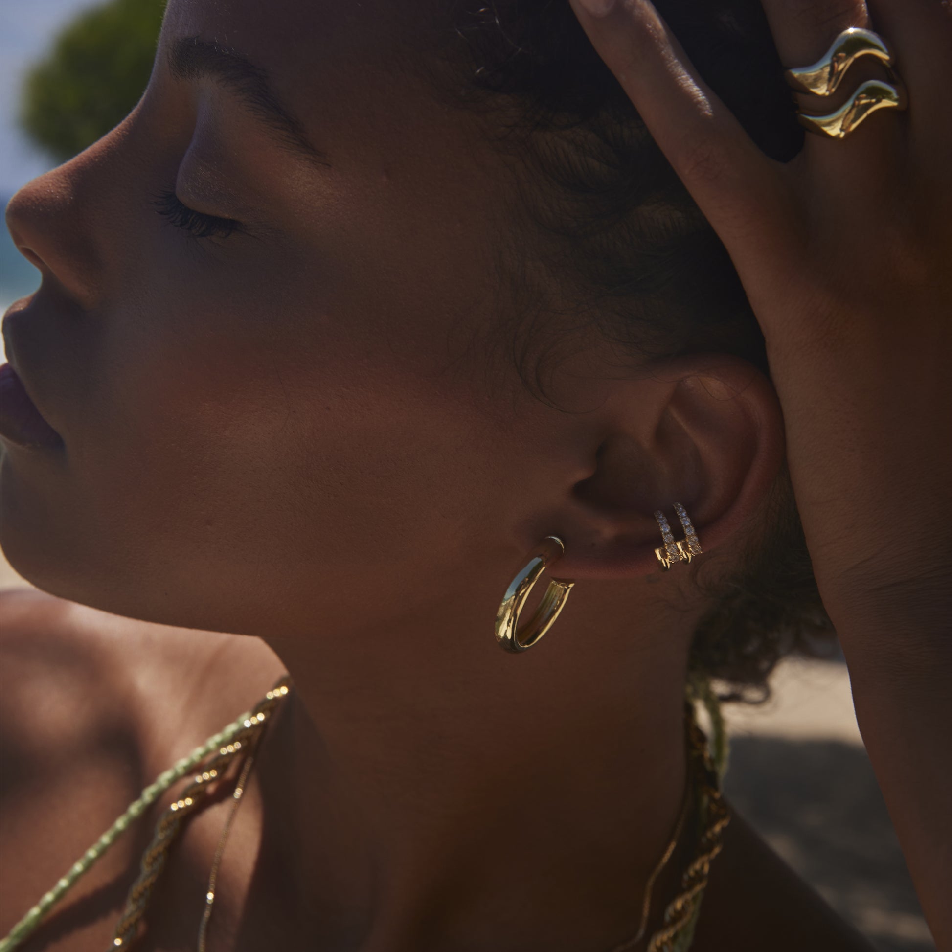 To wear, hold your earlobe and slide the cuff on from the bottom up. Find a space where the cuff rests comfortably without coming off.