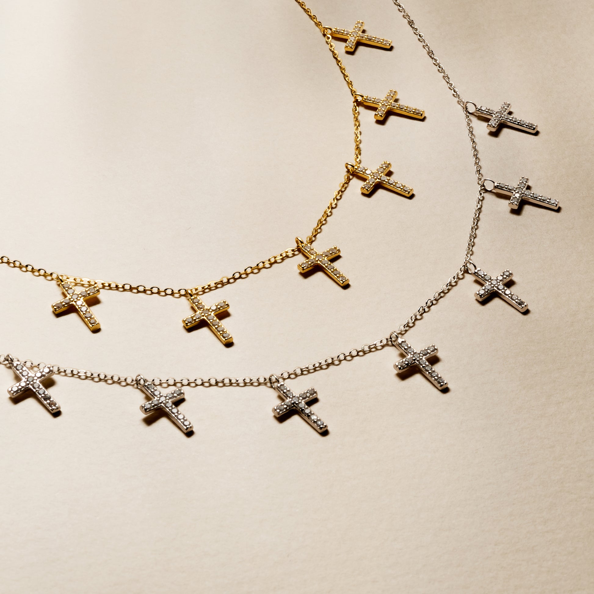 Adorn yourself in a stunning elevated version of the classic cross necklace. Complete with nine small pendants, this necklace makes a statement for you when walking into a room.