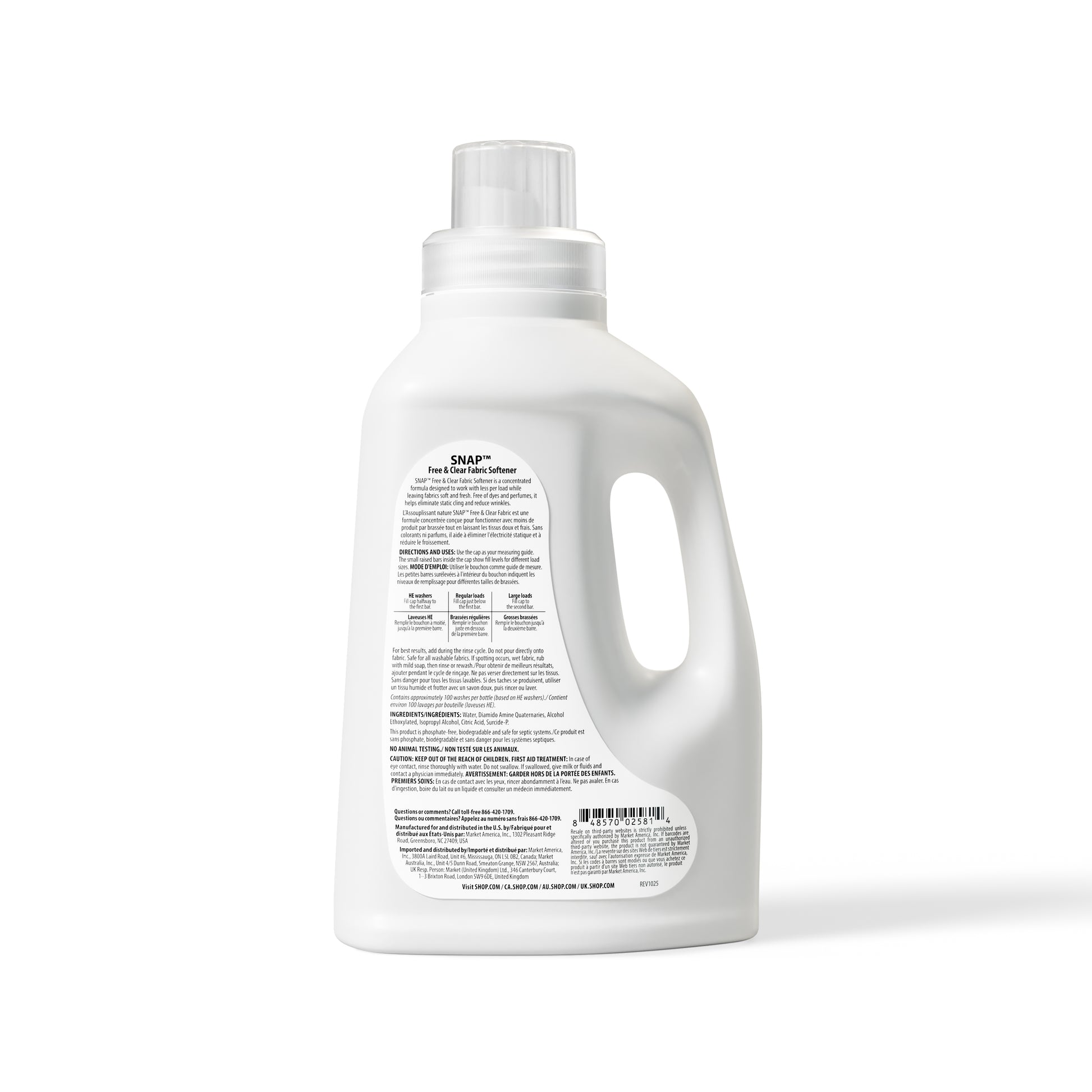 Snap™ Free & Clear Fabric Softener is a concentrated formula designed to work using less product per load, leaving fabrics soft and fresh. Free of dyes and perfumes, Snap Free & Clear Fabric Softener helps eliminate static cling and reduce wrinkles.