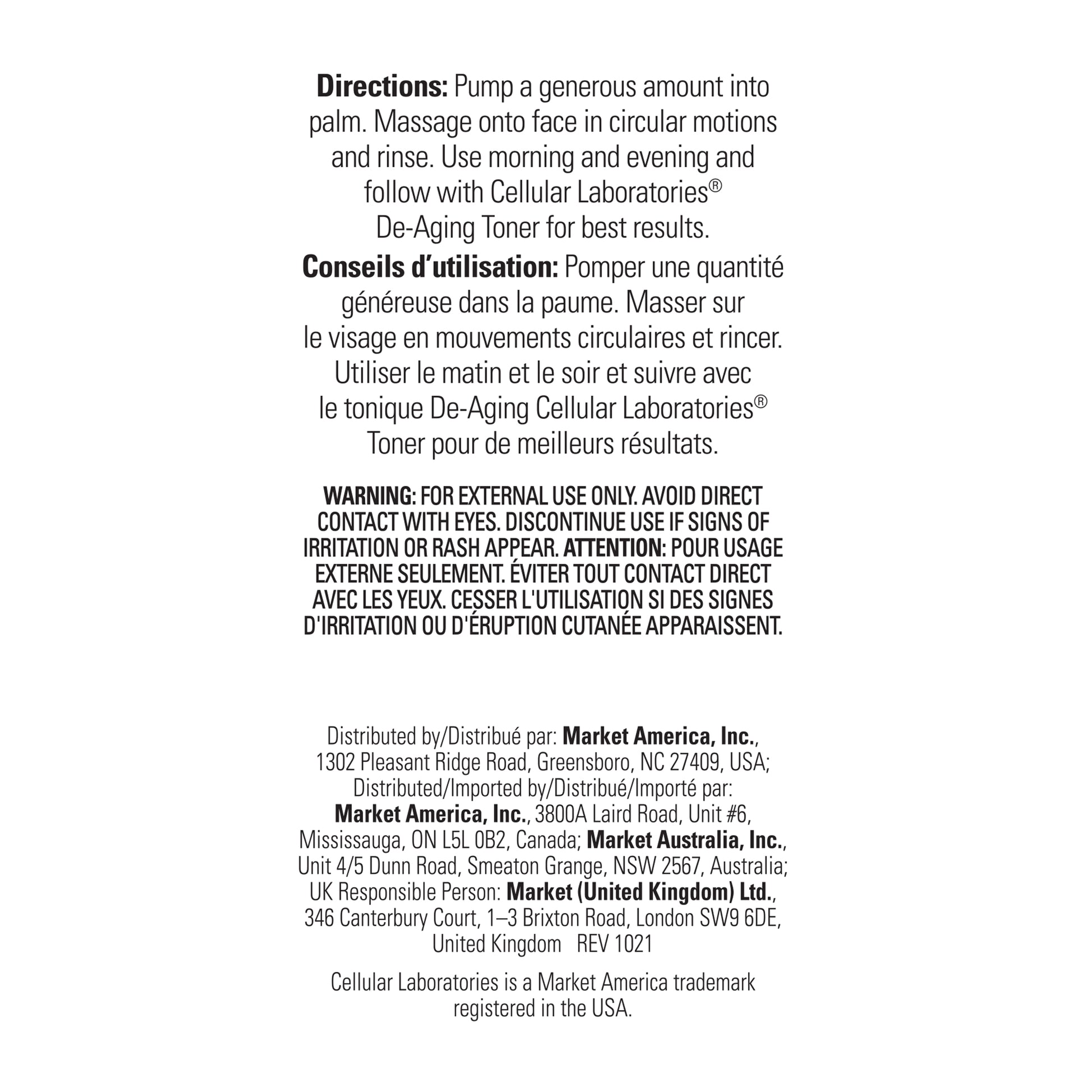 清潔是護膚程序中的重要一環,能使肌膚潔淨、舒爽,保持肌膚健康狀態。Cellular Laboratories青春舒顏洗面乳是富含植物性成分的泡沫洗面乳,可溫和清潔肌膚並能保留肌膚原有的水分。此多效的抗老化配方可為肌膚保濕滋潤,使肌膚更顯健康、年輕、充滿活力。配方完美綜合各種成分,有助提升肌膚保水度,並能溫和溶解肌膚上的化妝品與雜質。Cellular Laboratories青春舒顏洗面乳能幫助您深層潔淨肌膚,特別適合熟齡、乾燥的肌膚使用。