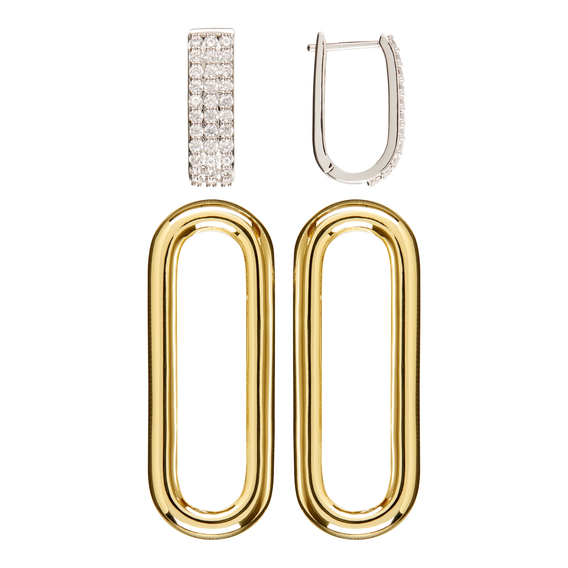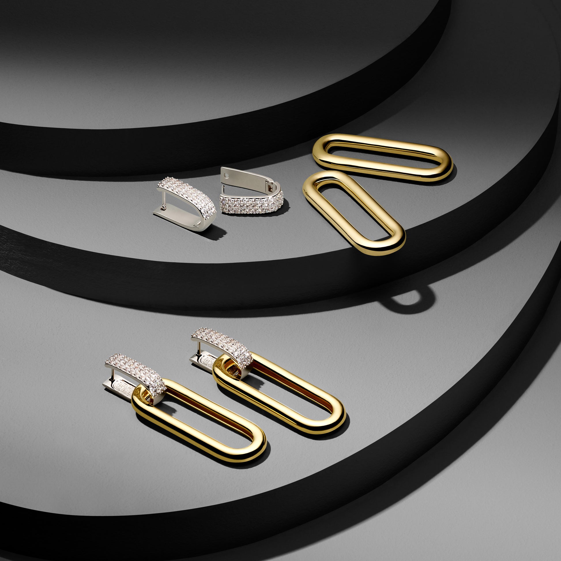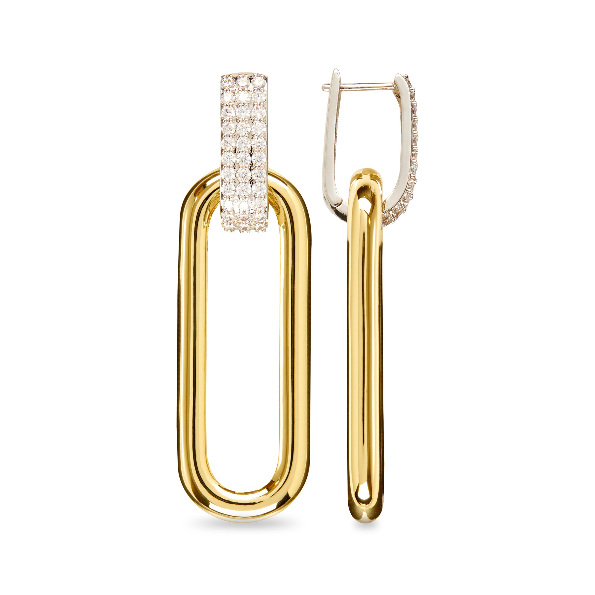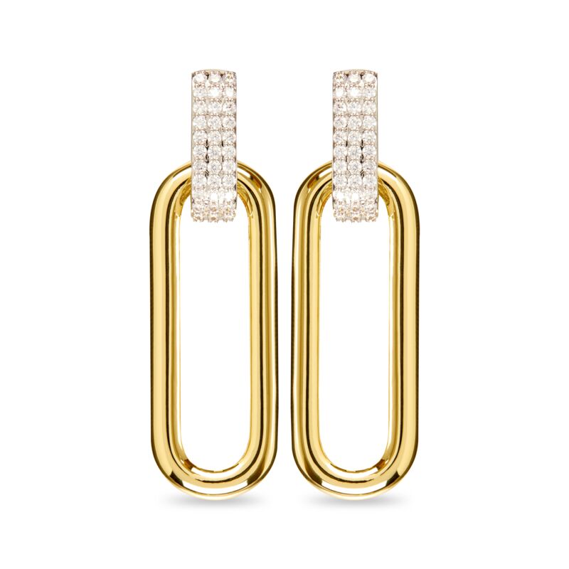 二合一的鍊環垂墜耳環,採用可轉換式設計,能以多種不同方式配戴,襯托百變造型。鍍金的橢圓形空心鍊環可從密鑲的銀白耳釘上輕鬆取下,作為小巧纖長的耳環單獨配戴。鍍金鍊環以中空工藝成就輕巧無比的質感,創造出長久的高度配戴性。