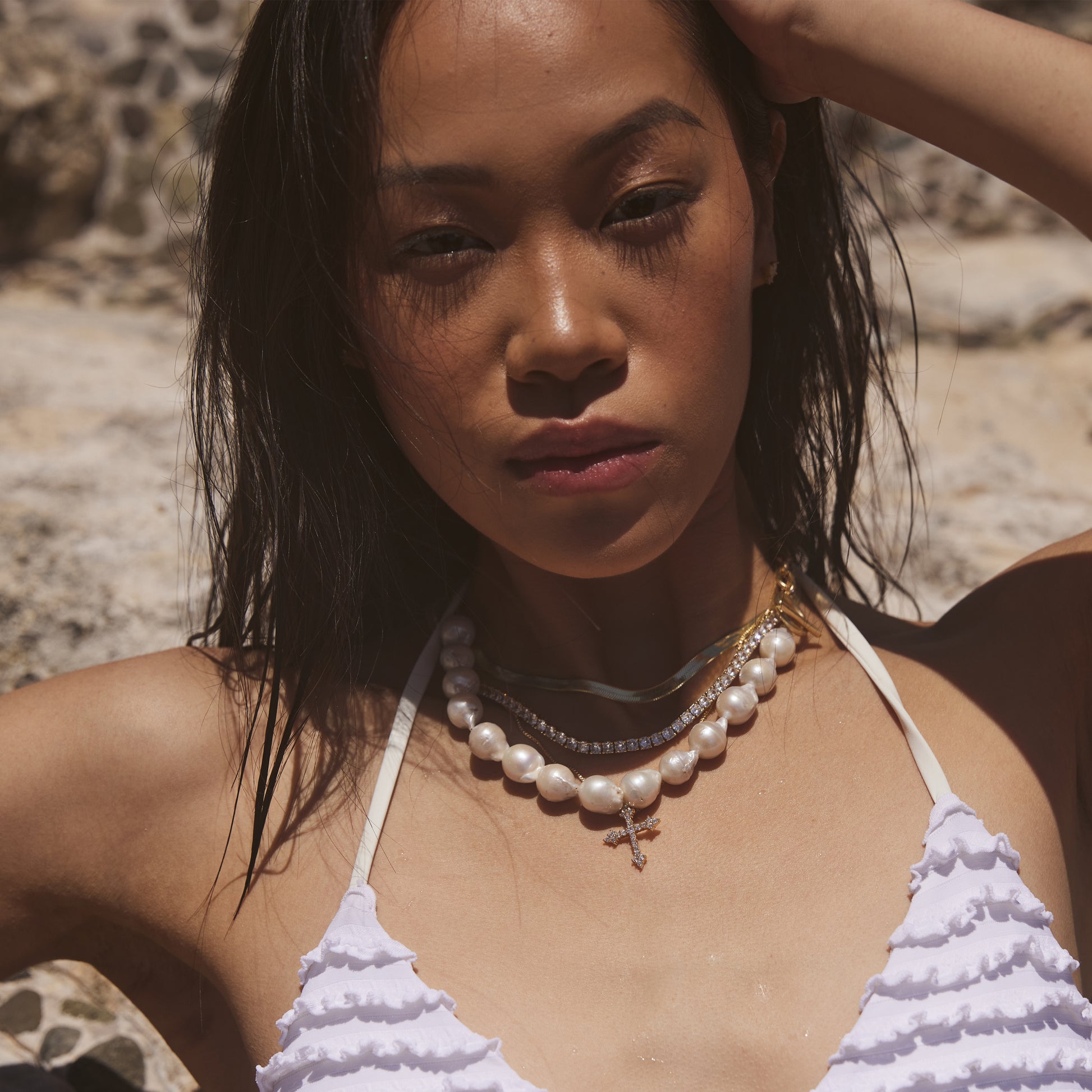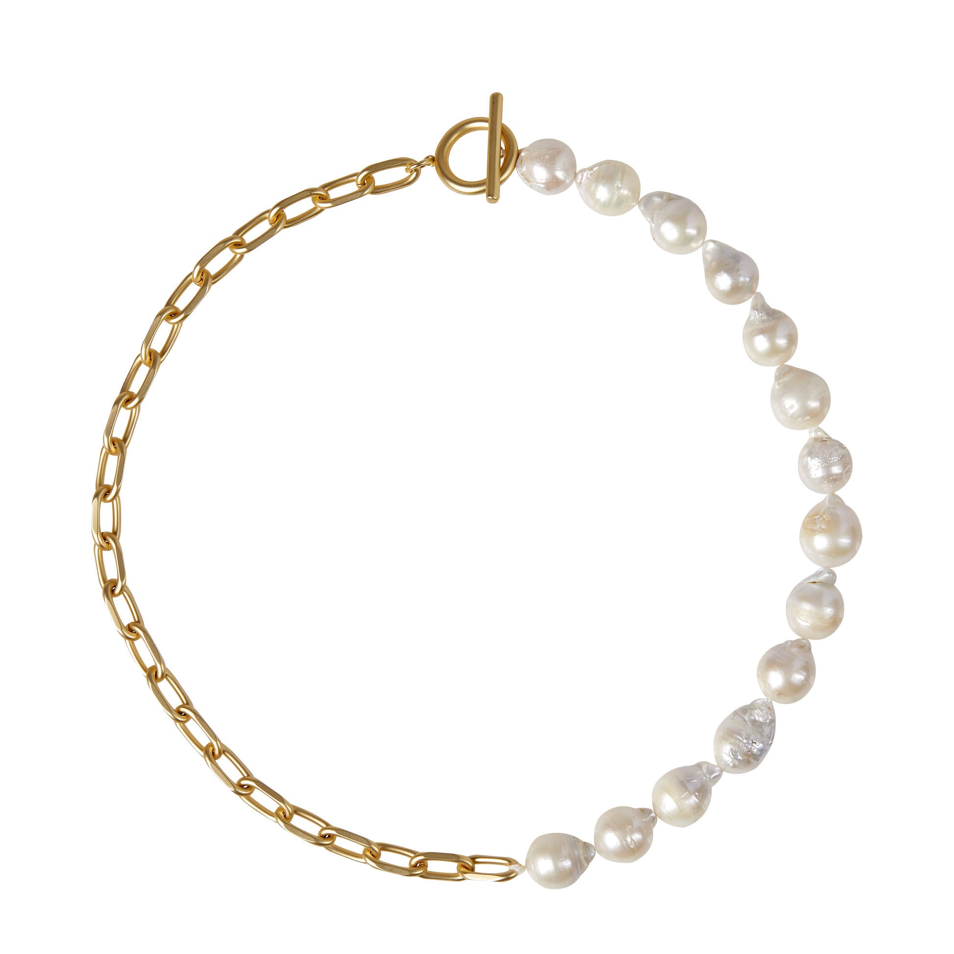 雋永珍珠的摩登變奏曲。珍珠與黃銅鍊條的別緻搭配彰顯典型酷女孩的別具一格。巴洛克養殖淡水珍珠形狀與尺寸各異,擁有天然形成的不規則外觀,正是典雅之美的高級呈現。