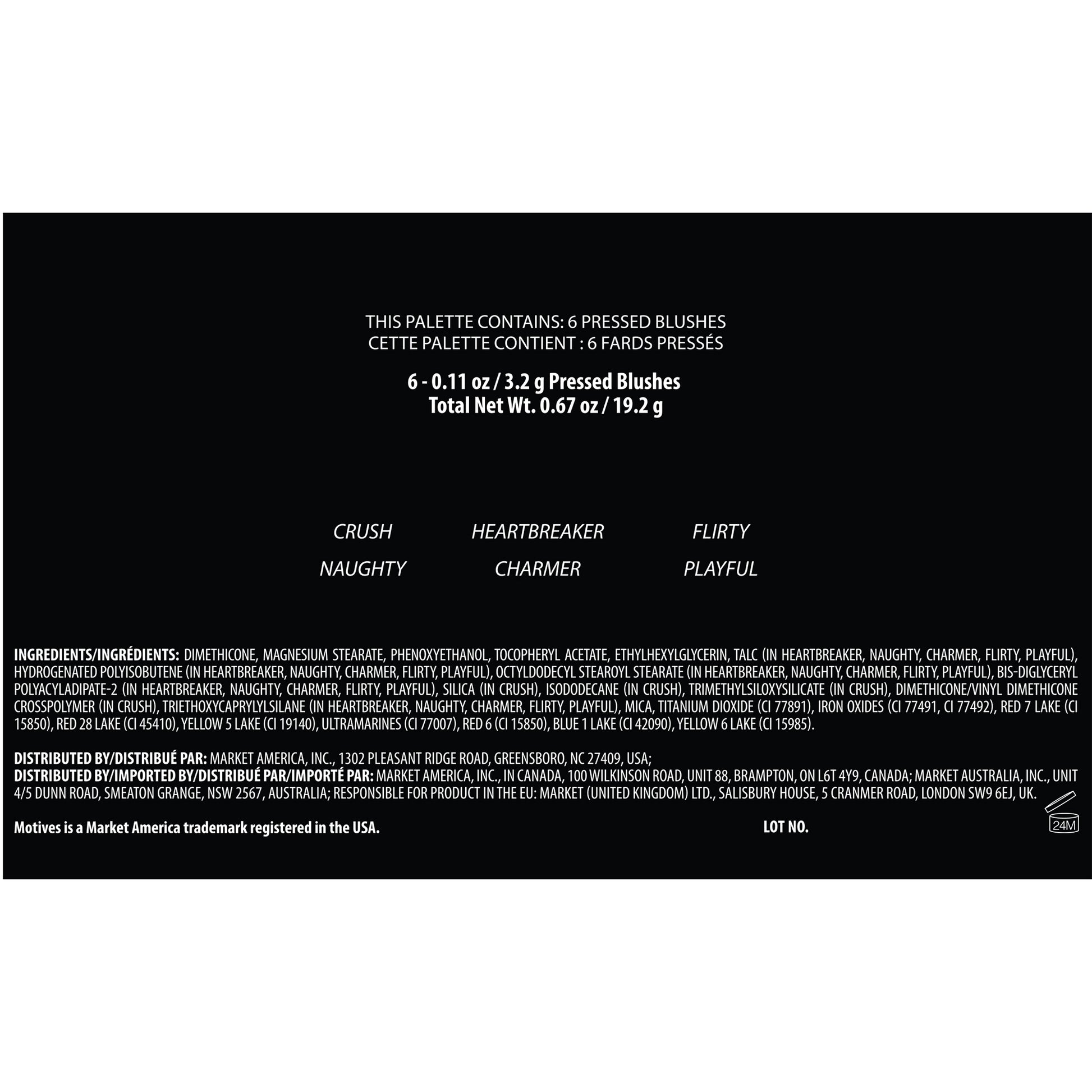 一起來玩轉頰妝!時刻保持自然紅潤、宛若陽光親吻的雙頰,Motives好氣色6色腮紅盤是您的美麗無敵祕密武器。歷經數月精心策劃與設計研發,非凡成就完美腮紅組合,多姿多彩、無可比擬,愛上那抹流轉於面頰的最自然、動人的色澤。輕盈薄透的柔美色調,輕掃著色,用量極省,細膩精緻,貼合雙頰,輕鬆勻妝。單擦綻放活力元氣,粉嫩誘人;或是多色混合疊擦,魅力啟動新一輪的迷人頰妝攻勢。包含一系列俏麗無雙的霧面、微光及珠光色調,解鎖無限可能。與立體6色修容盤和容光煥發6色打亮盤搭配,成就嬌艷可人的完整妝容。