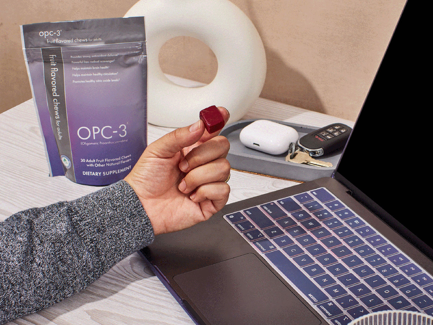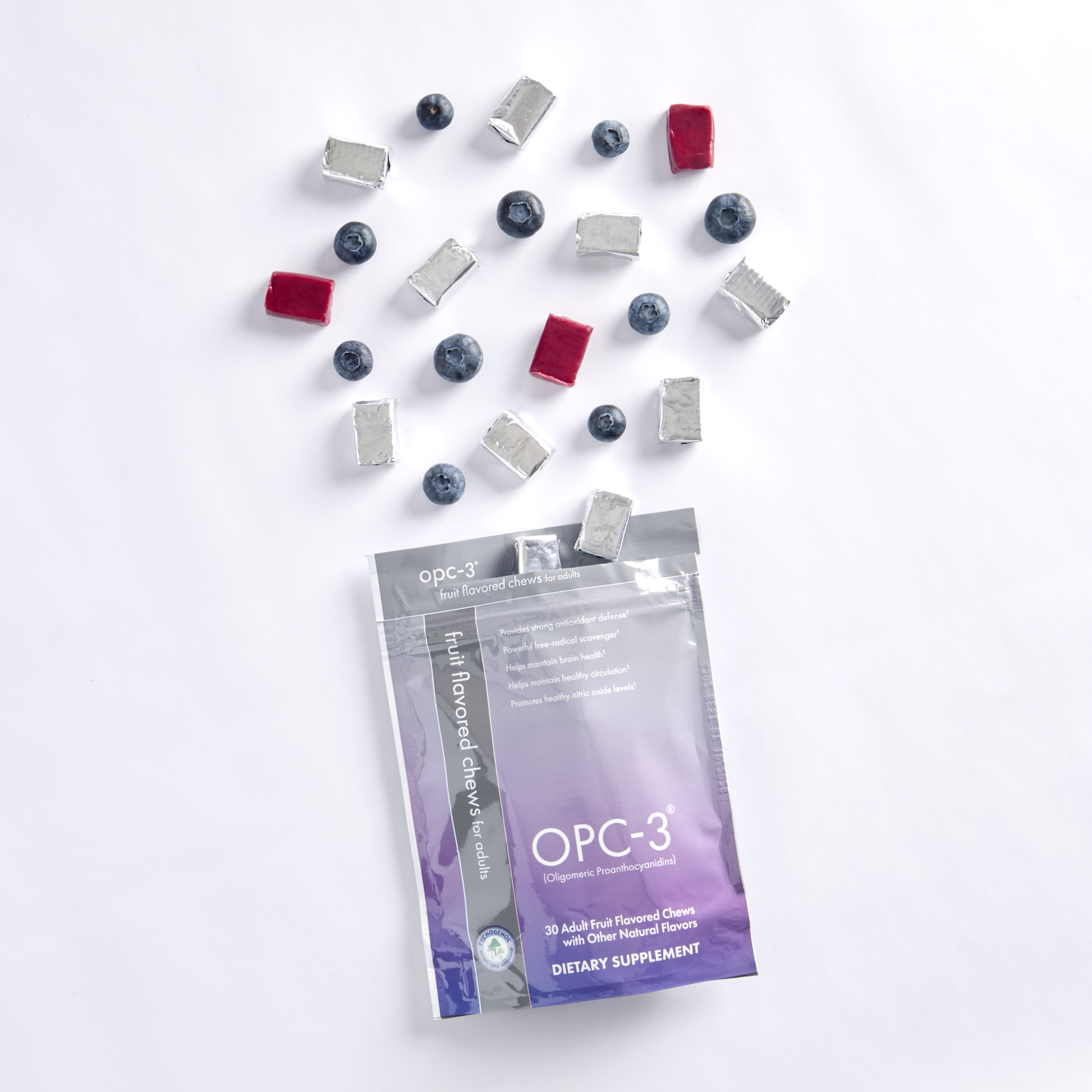 OPC-3 Chews include some of the most powerful bioflavonoids – biologically-active members of plant-derived compounds – currently known to research scientists. These bioflavonoids are scientifically termed oligomeric proanthocyanidins, commonly abbreviated OPCs. The best-researched OPCs include grape seed, red wine, grape skin, bilberries, citrus fruit, and pine bark extract, or Pycnogenol®. This combination of powerful OPCs is unique to OPC-3. OPC-3 has been shown to provide a variety of health benefits, including but not limited to, combating free radicals, helping maintain healthy cholesterol levels, helping maintain healthy circulation by strengthening capillaries, arteries and veins, helping maintain joint flexibility, helping promote/support cardiovascular health, helping reduce mild menstrual cramping, helping support visual health/visual acuity, scavenging free radicals, promoting/supporting healthy blood vessel dilation, promoting/supporting healthy nitric oxide levels, supporting a healthy complexion, helping maintain healthy blood glucose levels, supporting healthy platelet activity and supporting healthy sperm quality.*