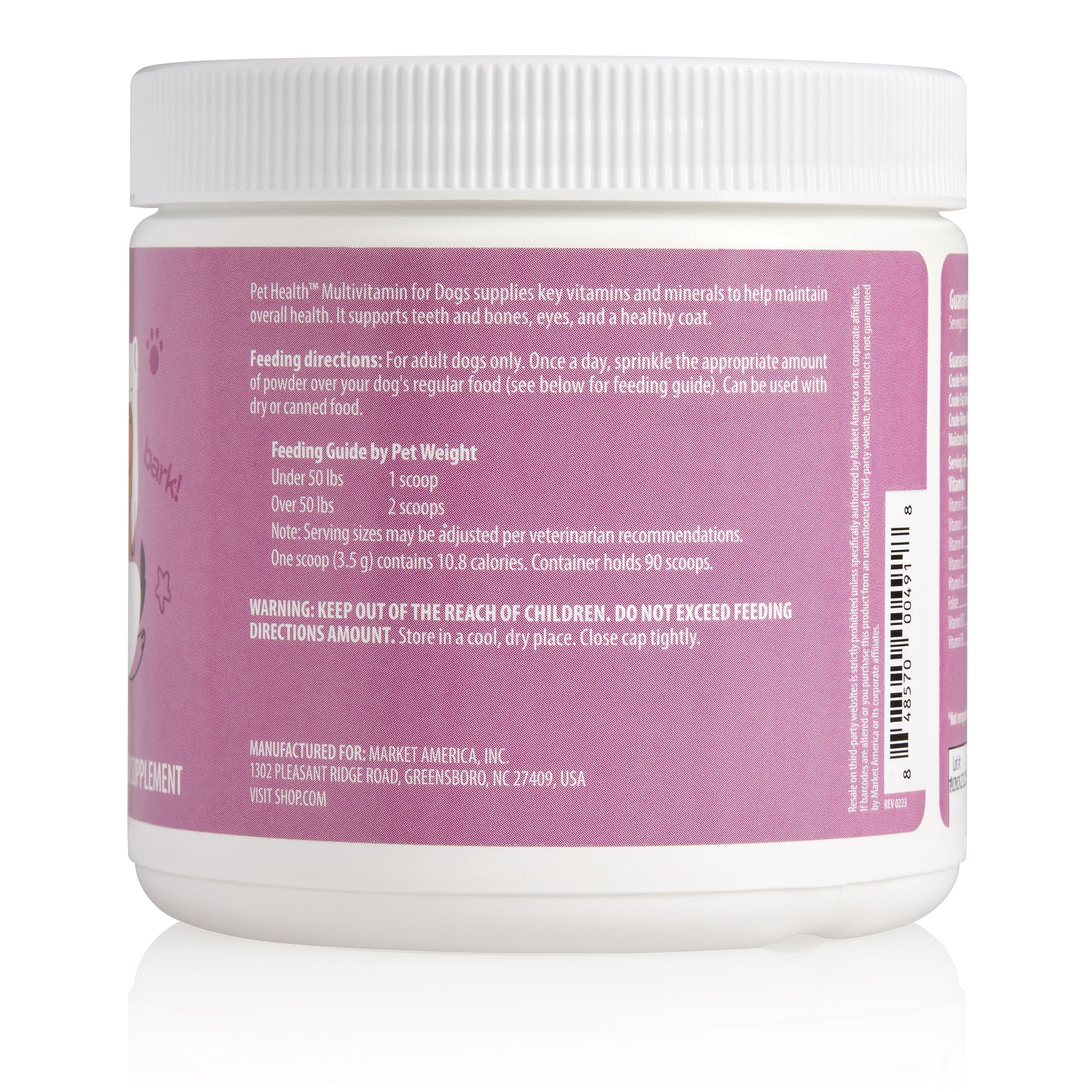 狗狗就如同人類,愈來愈常攝取過度加工或不健康的食物,並處在對身體有害的環境汙染下,健康會大受影響。營養不良並且經常性地承受環境刺激,會造成狗狗的各種健康問題。營養不良會讓狗狗的皮毛失去天然的質地與光澤。均衡的飲食及膳食營養的補充有助您的寵物維持良好健康。雖然飲食均衡可以為狗狗打下健康的基礎,有時只攝取食物無法提供所有需要的營養素,便無法滿足牠們身體的特殊需求。所有的動物對營養的需求都不同,因為年齡、活動力、成長環境、基因及品種等因素,都會大大地影響從食物中吸收的營養。因此,為寵物補充適當的營養非常重要;不但能維持牠們身體機能的良好運作,更能讓牠們活潑健康地成長。Pet Health狗狗綜合維生素配方在日常飲食之外為狗狗適量補充維持最佳健康所需的重要維生素與礦物質。Pet Health狗狗綜合維生素配方可幫助促進健康的肌膚與視力,有助身體組織的正常生長與修護,提供抗氧化能力,促進健康的免疫系統,維持消化健康。Pet Health - 先進的解决方案,讓寵物獲得最佳健康!