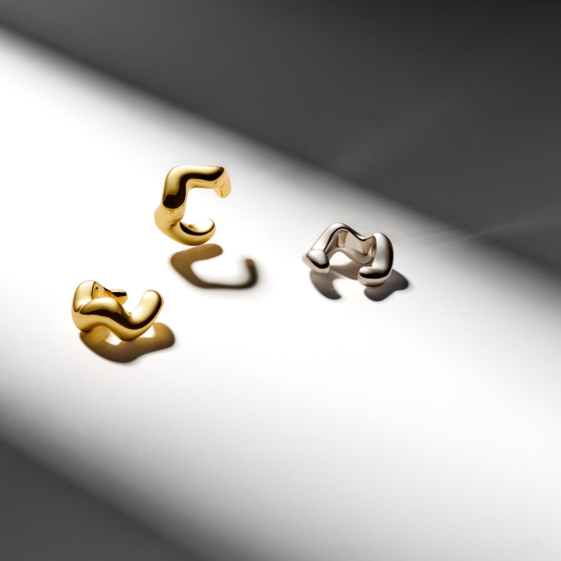 耳骨夾的波浪形設計彰顯著別具一格的時尚前衛。欲配戴或取下耳骨夾,輕握耳垂,將耳骨夾從下往上慢慢移動。找到使耳骨夾得以固定而不會脫落的最舒適位置。
