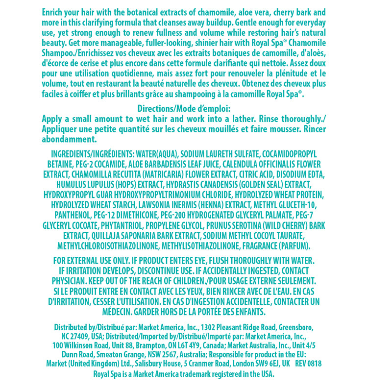 Royal Spa™甘菊洗髮精有何獨特之處? Royal Spa™ 甘菊洗髮精富含天然植物萃取精華,是質地溫和的洗髮精,適於每日使用。 Royal Spa™ 甘菊洗髮精能溫和洗淨附著於髮絲上的污垢,不會使秀髮乾澀,賦予髮絲自然光澤,同時能滋潤髮絲和頭皮,易於沖洗,使秀髮輕盈蓬鬆富彈性,燙染後的頭髮也可使用。本配方富含蘆薈和甘菊等植物萃取精華,並添加泛先醇,可幫助保持髮絲自然光澤和髮量。經常使用可使秀髮豐盈柔亮,易於梳理和造型。