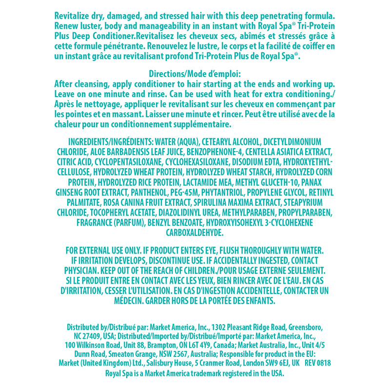 Royal Spa™蛋白質護髮乳有何獨特之處? Royal Spa™ 蛋白質護髮乳的豐富滋潤因子可深入滋潤乾燥、燙染的受損髮質,不需像其他護髮產品必須等候長達 15 分鐘之久。 內含的 植物萃取精華能充分滋潤髮絲,使受損髮質恢復健康活力, 同時讓乾澀毛燥的髮絲恢復柔亮光澤,使頭髮柔順易梳理。 使用方法: 洗髮後,取少量蛋白質護髮乳塗抹於頭髮上,尤其是髮尾部分,等候一分鐘後以溫水沖淨,再依個人喜好造型。蛋白質護髮乳加熱後使用更能強化護髮效果,少量使用護髮效果最佳。 環保配方設計 。