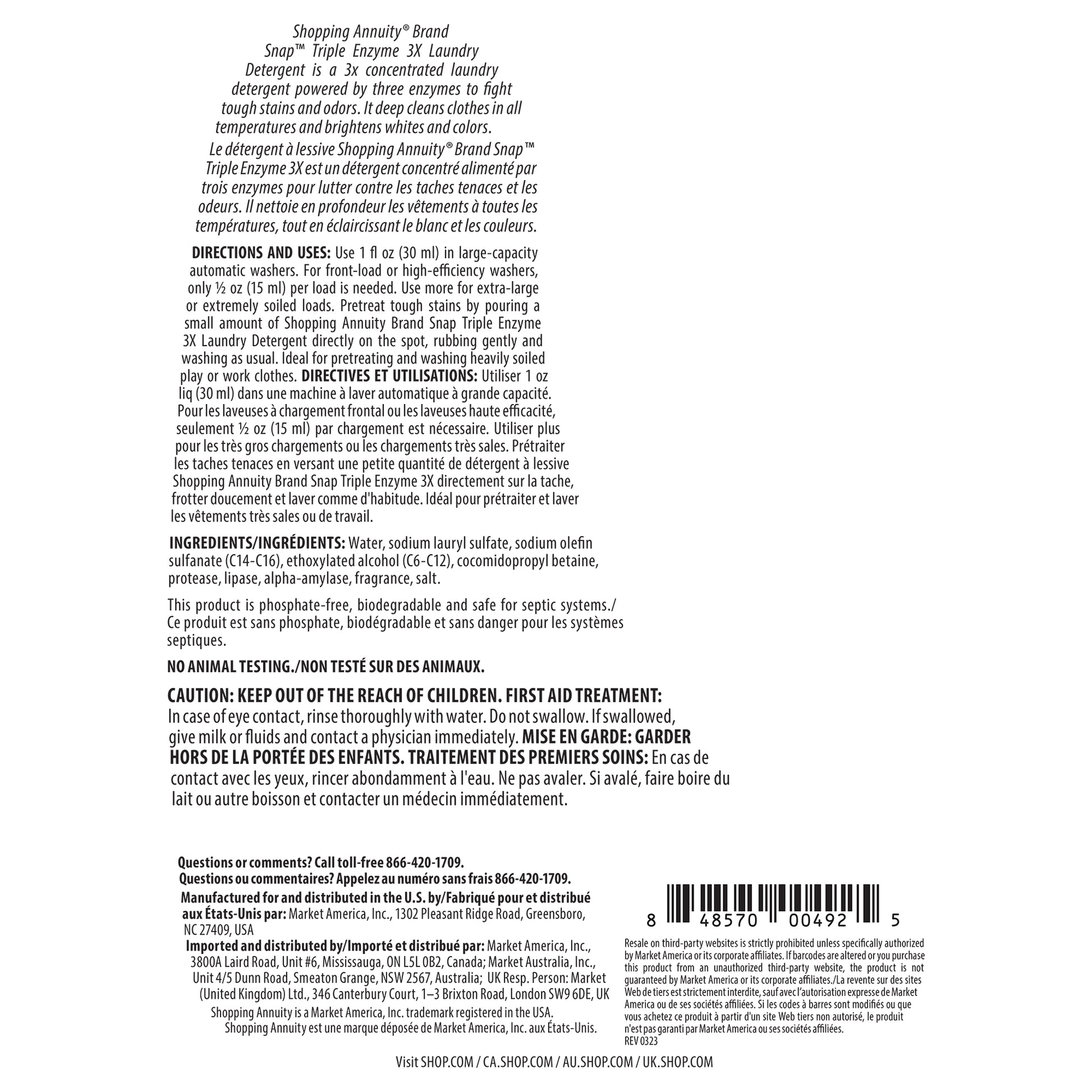 Snap™強力酵素高效洗衣精是一款不含磷酸鹽的高濃縮衣物洗滌劑,可滿足您所有洗衣的需求。Snap洗衣精適用於各種水溫,可安心使用於手洗材質及難清潔的合成纖維,也可用於頑垢如衣領汗漬、沙拉醬漬、烹調油漬、油汙及口紅印。一瓶洗衣精能洗衣多達80次。Snap洗衣精不傷害環境,可生物分解、無毒、無磷酸鹽,以植物性界面活性劑與精油製成,適合高效能滾筒洗衣機;只需使用建議量的一半即可。想要輕輕鬆鬆解決髒衣服?讓Snap洗衣精幫您搞定!